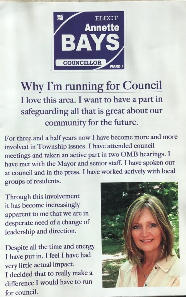 2018 Elections : Just before the elections when Bob Meadows and myself were councillors we were both put under harassment investigations as we gave evidence against the Township in the Everett Gravel Pit and went to the O.P.P with regards to the Post Retirement benefits. As the first investigation found that Bob Meadows and myself had the township best interest in mind. Then Deputy Mayor Doug Little who ran against me for Mayor, he together with the past CAO Eric Wargel who was directly involved in the Post Retirement Benefits and mileage claims without documentation contacted a new integrity commissioner Harold Elston who was suspended by the law society to provide a report on a harassment complaint against Bob Meadows and myself. Although Bob Meadows and I made the same statements at the Tribunal hearing, just before the 2018 elections I was accused of harassing the planner and Bob Meadows was cleared.