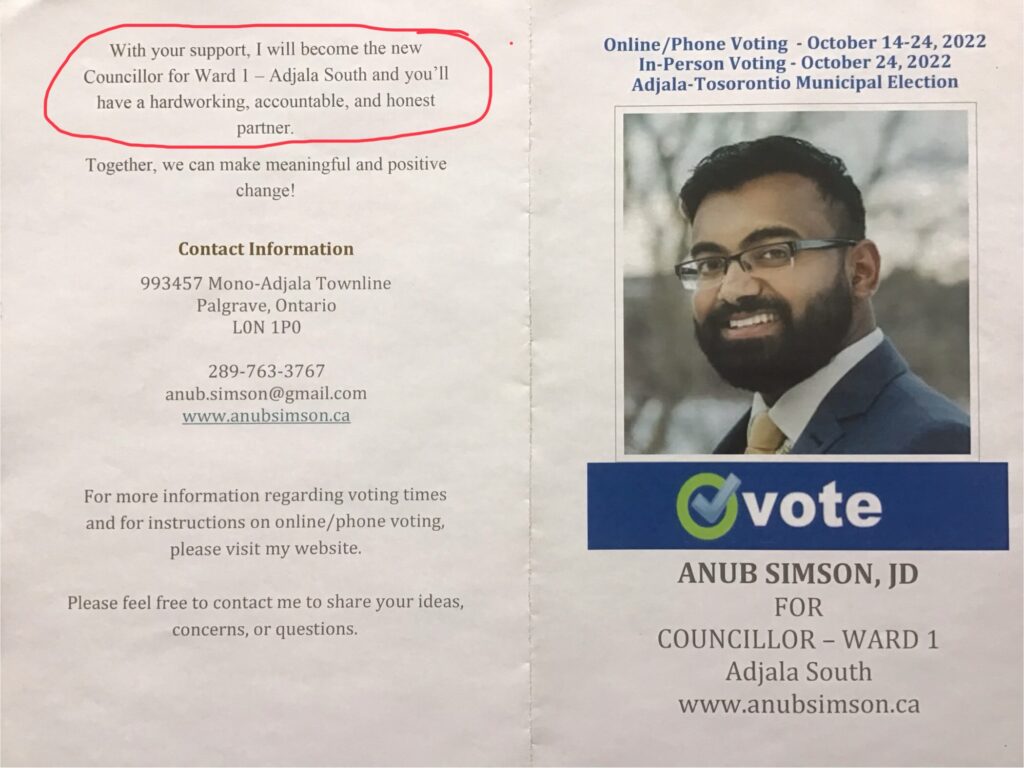 2022 Elections : Councillor Anderson and I were two mayoral candidates running for elections in 2022. Just before the elections, Scott Anderson put a motion to censure me which was supported by Councillor Annette Bays, Deborah Hall Chancey aka Deborah Hall and Jonathan Pita without any evidence for violating the numerous sections of the council code of conduct without any investigation by the Integrity Commissioner as required by law under the Municipal Act. This censure was put against me for the simple reason that I questioned the financials of Colgan and exposed the above 4 councillors involvement in approving engineers without permission from the Drainage Tribunal. Residents can read the documents in the links below.