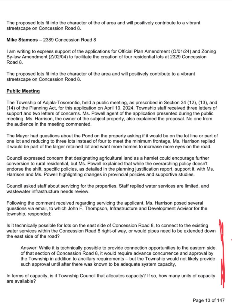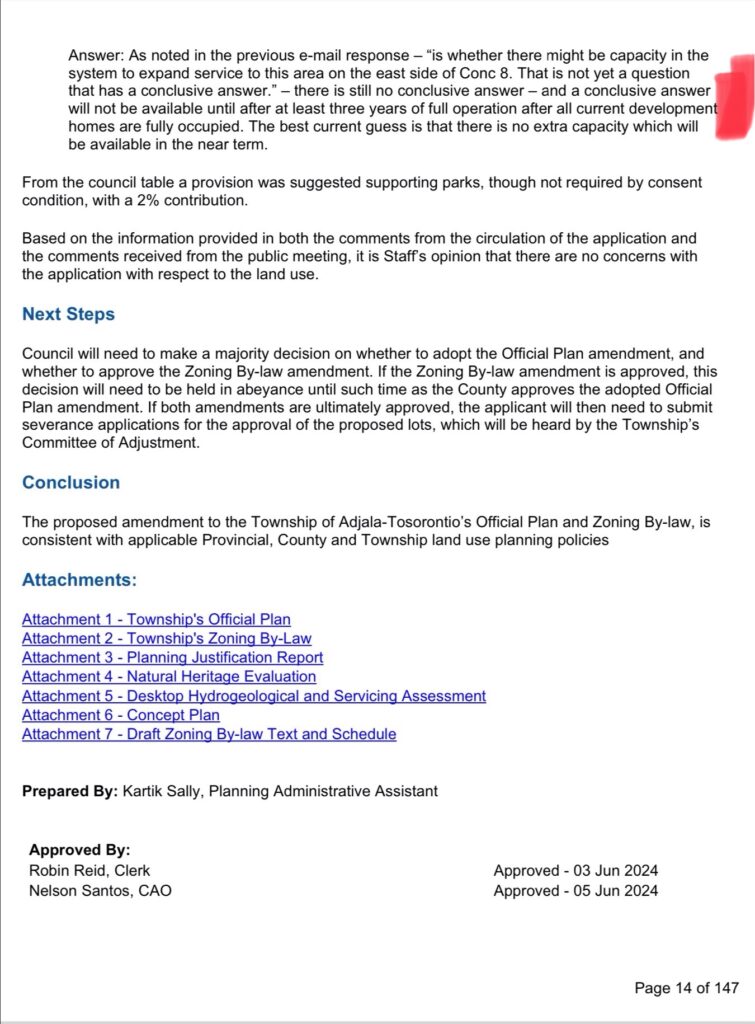 In the July 12, 2024 council meeting video recordings attached below, agenda item 14.4 a staff report came to council as a resident living besides the Colgan subdivision wanted to build 4 more homes on their property at 2329 concession 8. I have attached below two pages of the staff report on page 13 bottom and page 14 top marked in red. The same township engineer John Thompson who confirmed there was enough water for Colgan now states there may not be enough water to connect 4 more homes so the 4 homes will have to have their own wells and septic systems. Did Bob Meadows and I not always say there is not enough water in Colgan and we were told we were providing Lies and misinformation, the truth always comes out. What John Thompson has stated in his report and Mayor Scott Anderson said at the council meeting was that 4 more homes cannot connect to the water system in Colgan until all the homes are built in the subdivision as there is enough capacity only for the development. After all the homes are built the township can then see if there is additional capacity. The same with the sewer plant no more capacity for 4 more homes so the 4 homes will have to build private septic systems. If there is no water for 4 more homes, where will the water come from for the long term care / retirement home that is part of the subdivision?