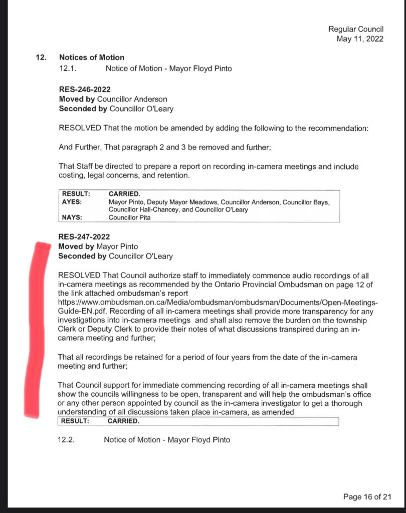 This is what goes on at in-camera meetings behind the backs of the residents. The mentality of you scratch my back and I will scratch your back is still active in our township office and council. To avoid problems of council having difficulties recollecting what was discussed in case of investigations, when I was Mayor, I got a resolution supported by all on council to record all discussions taking place at in-camera meetings (resolution RES-247-2022 attached below marked in RED). As of today no in-camera meetings are recorded so there is no proof of what is being discussed in case of any in-camera investigations. This is the transparency and leadership we have from our Township council under Scott Anderson. The reason the recordings could not start when I was on council was because it was a capital expense and would have to be approved at budget discussions. The next year was the elections and our current Mayor Scott Anderson did not follow up with the resolution to record the in-camera meetings. Of course, we as residents have to understand his position on recording these in-camera meetings. How can he support recording in-camera meetings when he is involved in petitioning the in-camera meeting that has been deemed illegal by the provincial ombudsman.
