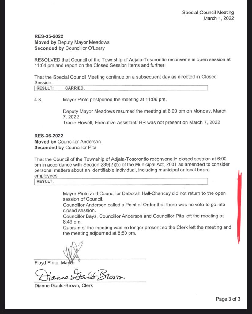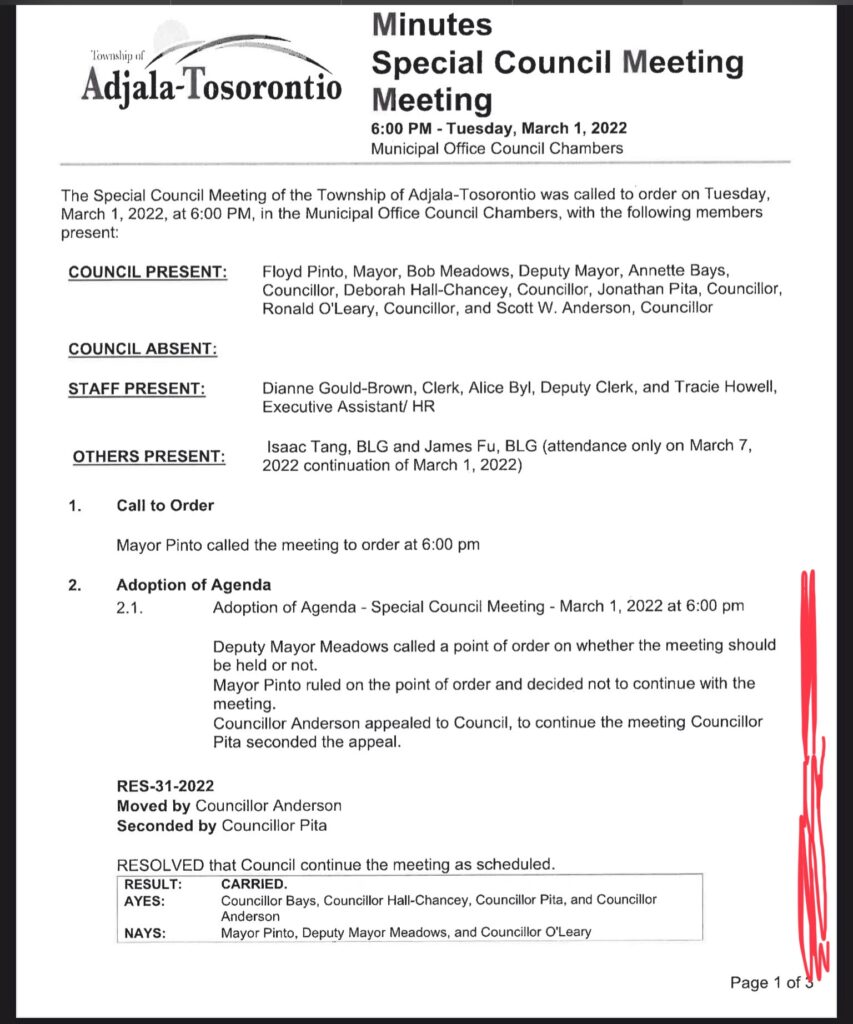 Read section 2.1 of the March 1, 2022 minutes below marked in red where I told the 4 councillors not to proceed with the meeting as the meeting the 4 councillors petitioned was against the Township Procedural Bylaw and the Municipal Act. However, they still went through with their attempt to dismiss the Treasurer. After I told council not to proceed Scott Anderson challenged my decision and he moved a motion to continue the meeting and Jonathan Pita seconded the meeting. In a recorded vote Scott Anderson, Annette Bays, Jonathan Pita, Deborah Hall Chancey aka Deborah Hall voted to continue with the meeting fully aware they were in violation of the laws. The Provincial Ombudsman investigated both meetings and agreed with my statement that the meeting was NOT an emergency meeting and was in violation of the Municipal Act. This is how your council operates.